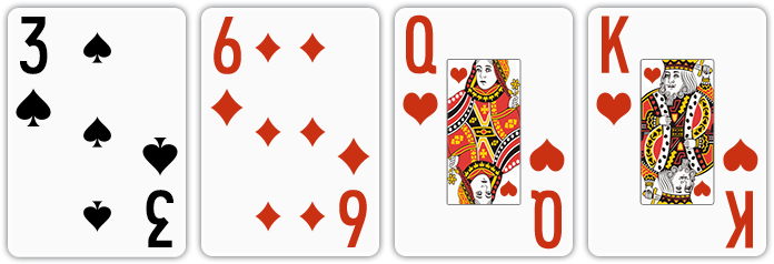 네 장의 카드 중에 카드 두 장의 무늬나 숫자가 같은 경우, 중복되는 무늬나 숫자의 카드 2장 중 높은 숫자의 카드를 빼고 나머지 3장을 베이스로 사용합니다. 이 때, 제외된 카드는 베이스끼리의 족보 비교에 사용되지 않습니다. |